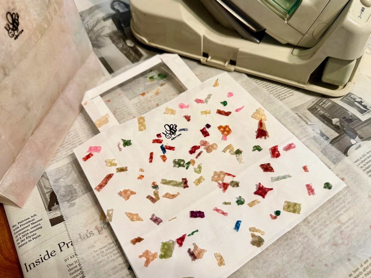 ミツロウシートのかけらをのせた紙袋とアイロン